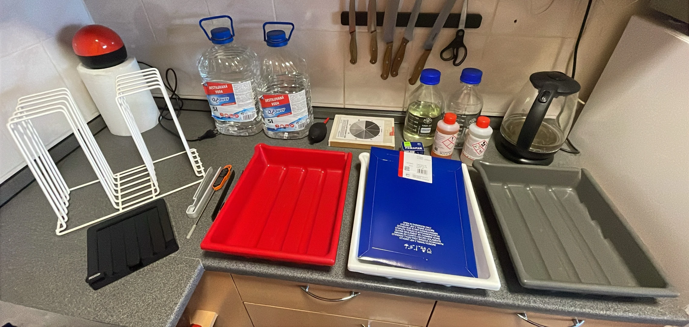 Fotit na film, vyvolat si sám své vlastní negativy a naskenovat obrázky do počítače je prostorově zcela nenáročné a s trouchou tmy to zvládne každý na větším stole. Proti tomu je vlastní fotokomora prostorově mnohem náročnější. Ale povedlo se a kruh se uzařel :)